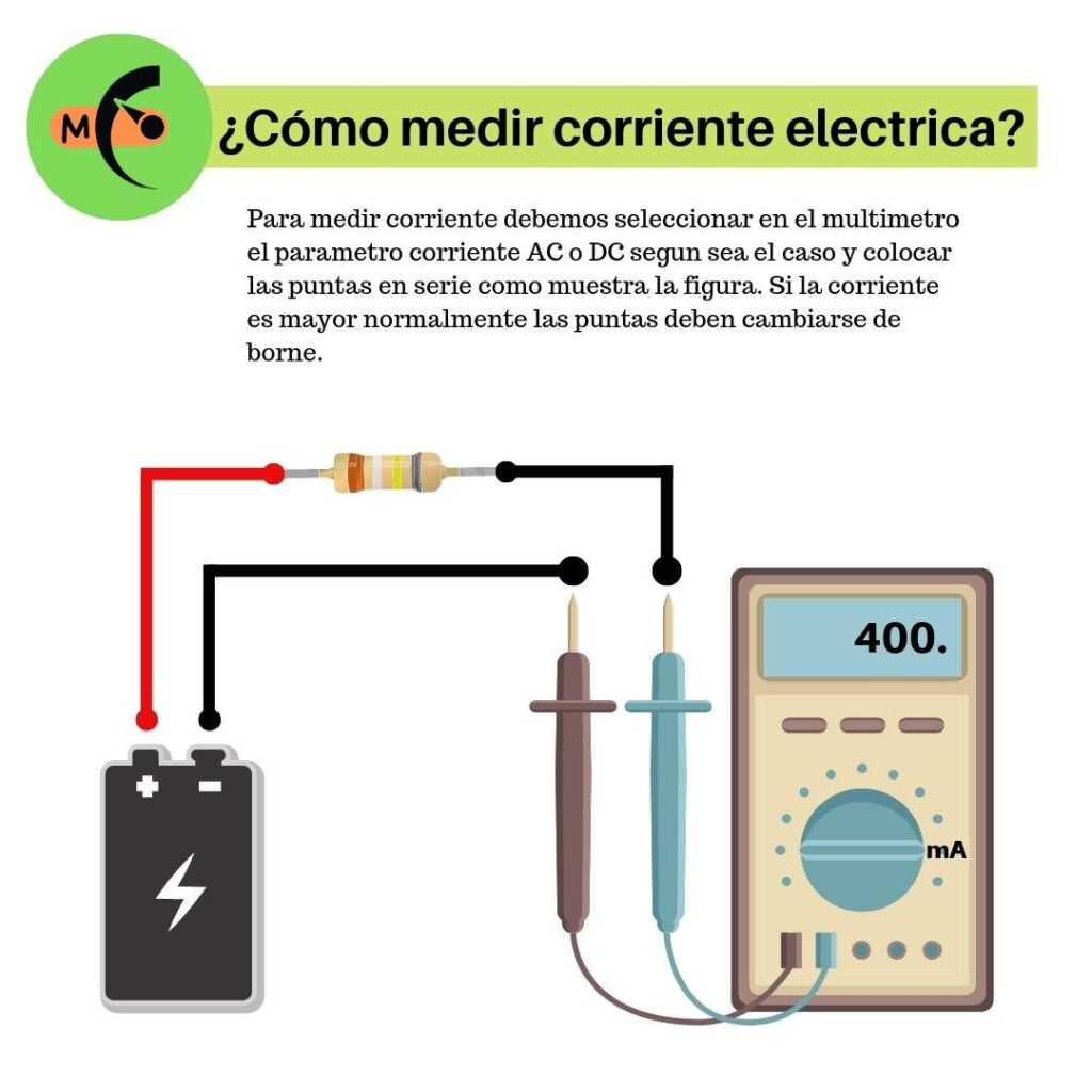 El proceso de medición de corriente es bien diferente al anterior. La corriente se mide en A (Amperes) y la conexión a realizarse es en serie.