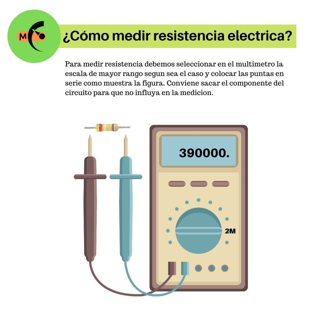 Para medir resistencia lo hacemos seleccionando la escala mayor correspondiente, si no se conoce el valor de R, y colocando las puntas entre los pines del resistor a medir.